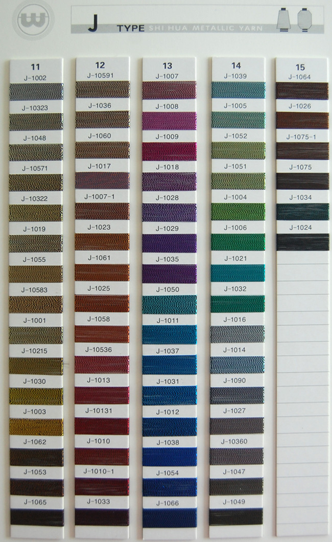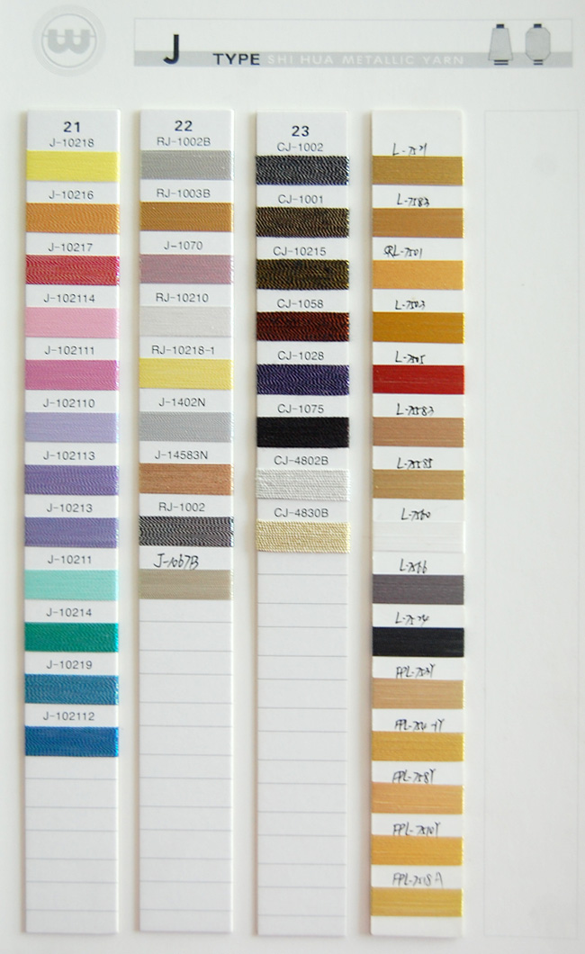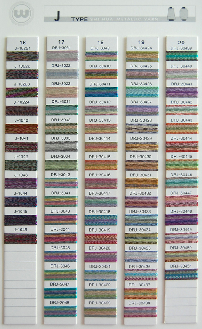 J type products are prepared by winding single-strand metallic yarn slices and yarns of nylons, terylene, artificial yarns, cotton yarns, etc. The products, also called embroidery threads, are bright in color and good in strength, and widely applied to computer embroidery, hand embroidery, fishing gears, trade marks, mesh belts, sweaters, warp weaving cloth, etc. |